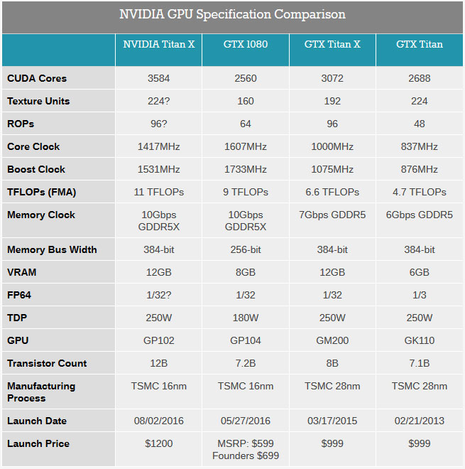 Итак, чем же NVIDIA Titan X отличается от своего предшественника – GTX Titan X? Во-первых, количество ядер CUDA возросло с 3072 до 3584. Текстурных блоков теперь не 192, а 224. Частота GPU составляет 1417 МГц вместо 1000 МГц с возможностью разгона до 1531 МГц. Производительность новой видеокарты составляет впечатляющие 11 TFLOPs. Чтобы вы могли представить себе разницу — у GTX Titan X производительность находится на отметке 6,6 TFLOPs, а новая карта GTX 1080 выдаёт 9 TFLOPs.